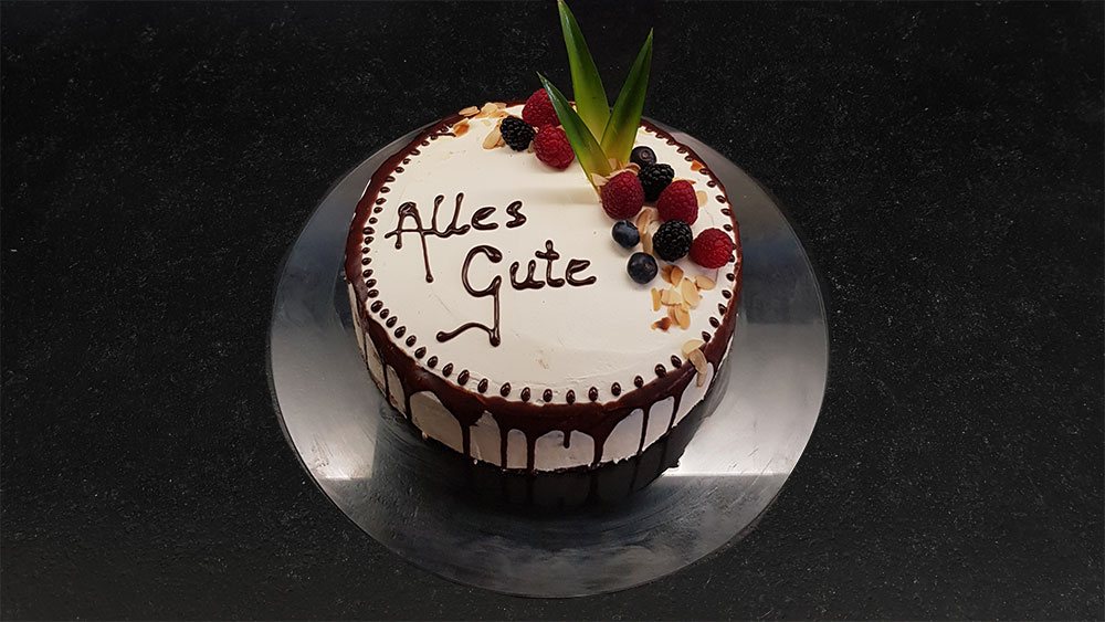 Als Topping kommt dann eine Glasur auf Ihr Werk. Verziert wird das Ganze mit Schokolade, frischen Früchten oder Cremen. Der Phantasie sind keine Grenzen gesetzt. Beschriftungen und Dekoelemente sind natürlich auch möglich.